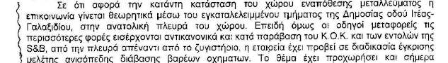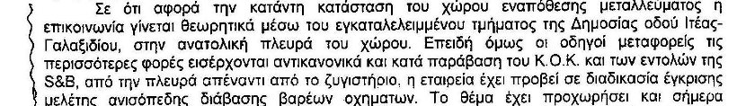 Με έγγραφό της με αρ. πρωτ. 8783/26-10-2010 η υπηρεσία αναφέρει ξεκάθαρα ότι τα φορτηγά με βωξίτη από την σημερινή Εθνική οδό επικοινωνούσαν τότε (το 2010) με το παραλιακό μέτωπο των εγκαταστάσεων , μέσω του εγκαταλελειμμένου τμήματος της Δημόσιας οδού Ιτέας - Γαλαξιδίου. Σήμερα έχουν νέο ανισόπεδο κόμβο.