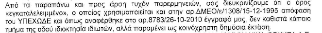 Σε δεύτερο έγγραφό της με αρ. πρωτ.9475/2-11-2010 η ίδια υπηρεσία διαβεβαιώνει ότι η παλαιά εθνική οδός παραμένει σε δημόσια χρήση, δηλαδή θα έπρεπε ο κάθε Έλληνας πολίτης να έχει την επιλεκτική δυνατότητα να πάρει το αυτοκίνητο ή το ποδήλατό του και να πάει βόλτα στην παραλία της Καμιώτισσας χωρίς να βγει στην σημερινή Εθνική Οδό! Το είπαν αλλά ποτέ κανείς δεν έπραξε το παραμικρό για την αποκατάσταση της καταπάτησης.
